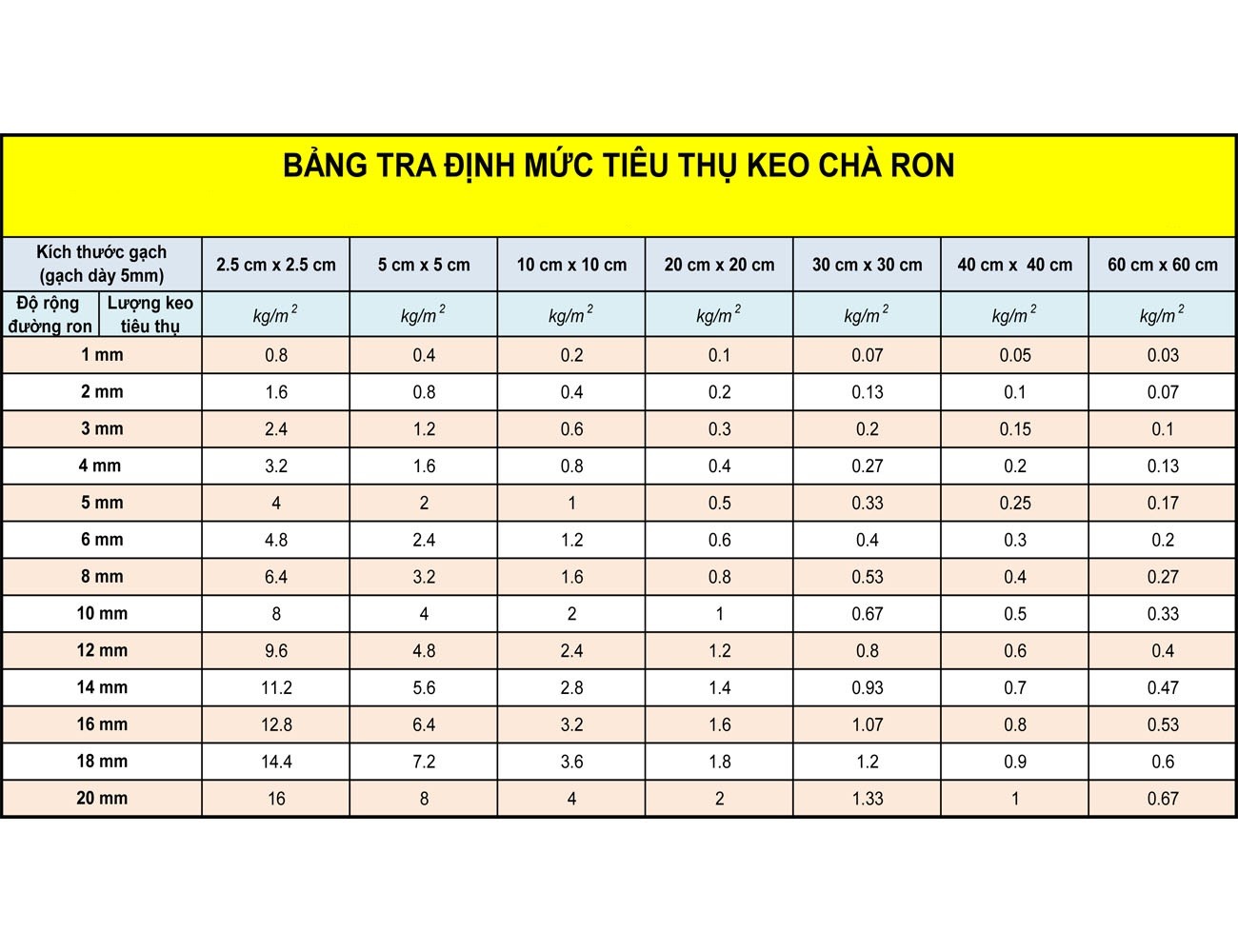 LƯỢNG KEO CHÍT MẠCH CẦN DÙNG = (( Chiều dài gạch + chiều rộng gạch ) / (chiều dài gạch x chiều rộng gạch )) x bề dày gạch x bề rộng ron gạch